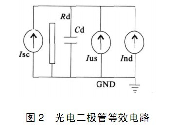 圖2 中I sc為光電流; Rd 為二極管內(nèi)阻; Cd 為二級(jí)管結(jié)電容; I ns 為二級(jí)管的散粒噪聲電流; I nd為二極管內(nèi)阻的熱噪聲電流。 光電二極管與后續(xù)的理想運(yùn)放構(gòu)成前置放大電路時(shí), 影響其性能參數(shù)的因素主要是以下幾點(diǎn):