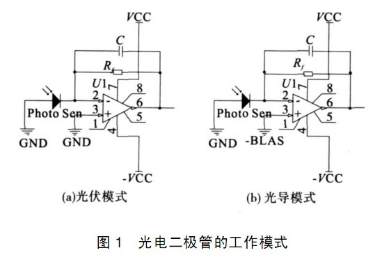 光電二極管可以在2 種模式下工作, 一是零偏置的光伏模式; 一是反偏置的光導(dǎo)模式,具體電路如圖1 所示。 在光伏模式時(shí), 光電二極管可以非常精確地線性工作; 而在光導(dǎo)模式時(shí), 光電二極管能夠?qū)崿F(xiàn)較高的切換速度, 但要犧牲線性; 同時(shí), 反偏置模式下的光電二極管即使在無光照條件下也會(huì)產(chǎn)生一個(gè)極小的暗電流, 暗電流可能會(huì)引入輸入噪聲。 因此選用光伏模式。