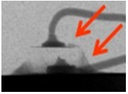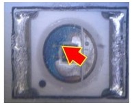 2. 變色:這類失效是指LED不點(diǎn)亮的狀況下,外觀顏色或膠材透明度與新品不同,用肉眼即可看出,通常在產(chǎn)品使用一段時間或在做完可靠度試驗后發(fā)生。一般說來,變色區(qū)域大致可區(qū)分為發(fā)生在導(dǎo)線架或封裝膠材兩類,若發(fā)生在導(dǎo)線架,通常是因為表面與環(huán)境中的化學(xué)物質(zhì)發(fā)生反應(yīng),如氧化或硫化,要分辨屬于哪種需仰賴成份分析,可使用的儀器包含有EDS(Energy Dispersive X-ray Spectroscope)、XPS(X-ray Photoelectron Spectrometer)、AES(Augur Electron Spectroscope)等等。若是封裝用的膠材發(fā)生變色,則屬于高分子材料的劣化現(xiàn)象,如環(huán)氧樹脂易受高溫或是紫外光影響而變黃,因此白光LED多改采矽膠取代之。分析此類失效應(yīng)特別留意,因膠材本身有一定的透明度,有時變色的導(dǎo)線架因被膠材蓋住而誤判為膠材變色,引導(dǎo)至錯誤的改善方向。