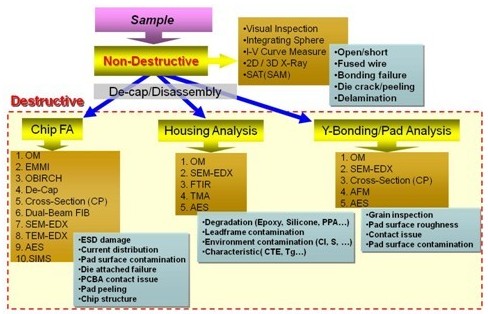 從上可知,一個LED產(chǎn)品的失效,起因可能來自于該產(chǎn)品的任何一個部份,故必須抽絲剝繭方能找到真正的失效原因。針對失效來自LED燈粒而言,因完整的LED燈粒中,LED chip本身很強(qiáng)壯,但包復(fù)chip的封裝材料則易遭受損傷,因此,LED燈粒的失效多可歸因于封裝材料的破壞或劣化所導(dǎo)致。若要充分解析這類失效,牽涉到光學(xué)、化學(xué)、材料學(xué)、電子物理學(xué)等領(lǐng)域的專業(yè)知識,并搭配精密的儀器與豐富的實務(wù)經(jīng)驗,才能確認(rèn)失效點(diǎn)并推導(dǎo)真因,進(jìn)而提出改善對策。