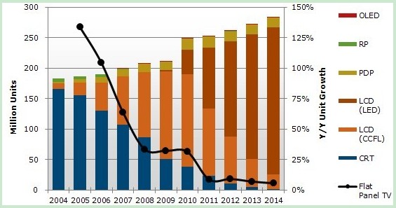 2004-2014年從技術(shù)類型預測全球電視出貨情況