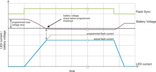 如果閃光燈驅(qū)動器本身能夠防止電池電壓下降過多,那么就可以保持較小的安全界限。通過使用一個受控轉(zhuǎn)換率升高 LED 電流,并在上升期間持續(xù)監(jiān)控電池電壓可以實現(xiàn)這一目標(biāo)。