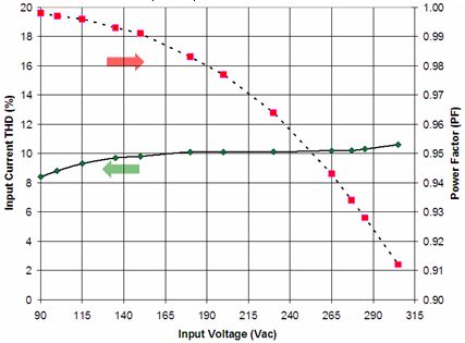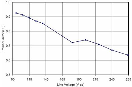 在針對商業(yè)照明的應(yīng)用中使用的是寬動態(tài)范圍的精確導(dǎo)通時間控制器方案NCL30000。設(shè)計中采用控制器(外置FET等旁路元件)方案的原因包括易于在能效和成本之間實現(xiàn)折衷、能以單顆控制器支持寬功率范圍(5到30 W)、及便于優(yōu)化散熱及靈活布線等。基于NCL30000構(gòu)建的90到305 Vac EFD25演示板(Vout = 12 LED, 37 Vdc)測試顯示,功率因數(shù)遠高于0.9,部分輸入電壓條件下功率因數(shù)甚至高于0.95(見圖9),能效也極高。