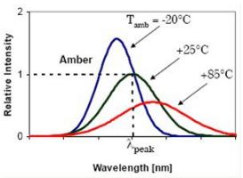 圖6. LED發(fā)光的峰值波長(zhǎng)隨環(huán)境溫度而變化