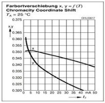 為了改變LED的亮度,最簡(jiǎn)單的方法就是改變其正向電流。但是,正向電流的改變會(huì)引起光譜的改變,對(duì)于白光LED,會(huì)引起其視在色溫的改變,顯然這是不希望的(圖7)。