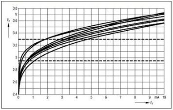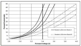 即使是同一型號(hào)的LED其伏安特性在各個(gè)個(gè)別的器件之間也是不同的,更何況在不同生產(chǎn)廠家之間就更是不同了(圖8)。