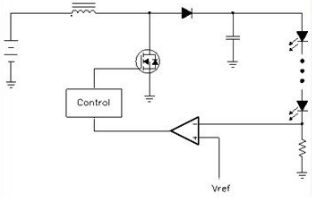 圖中顯示了一個(gè)基本的電感升壓電路,其中控制器(Control)給出了一個(gè)PWM開關(guān)信號(hào)來控制大功率開關(guān)管,后者在導(dǎo)通時(shí)對(duì)電感充電,而在斷開時(shí)電感中的能量就對(duì)電容充電。經(jīng)過幾次開關(guān)以后就可以把輸入電壓泵至更高的電壓,從而完成升壓的任務(wù)。改變PWM信號(hào)的工作比就可以改變其輸出電壓。為了保持輸出電流的恒定,就要求測(cè)量輸出電流值,這是靠一個(gè)和LED串聯(lián)的小電阻來測(cè)量的。這個(gè)電阻上的電壓就和一個(gè)參考電壓相比較,比較所得出的誤差信號(hào)就送去控制器用以改變PWM信號(hào)的工作比,這樣就實(shí)現(xiàn)了一個(gè)閉環(huán)自動(dòng)控制,以控制其輸出電流為恒定。