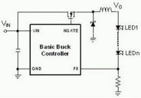 通常儲(chǔ)能電感是和LED串聯(lián),開關(guān)導(dǎo)通時(shí),電感儲(chǔ)能;開關(guān)斷開時(shí)電感通過二極管繼續(xù)有電流流通。由于輸出電壓是輸入電壓減去電感電壓,所以是降壓型。LED中的電流經(jīng)過檢測(cè)電阻測(cè)量以后反饋回控制器。來控制PWM的工作比,以實(shí)現(xiàn)恒流的控制。