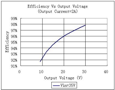 降壓型恒流源的缺點(diǎn)是要求輸入電壓高于輸出電壓,而太陽(yáng)能LED路燈中所采用的蓄電池往往是12V,頂多是24V。而路燈中的LED通常是10個(gè)串聯(lián),其所要求的總輸出電壓往往在33V-36V左右,因此較難采用降壓型的恒流源。而降壓型恒流源的優(yōu)點(diǎn)是效率高。因?yàn)檩斎腚妷焊哂谳敵鲭妷海暂斎腚娏餍∮谳敵鲭娏鳌k娏餍∮兄跍p小電阻性損耗。圖15表明一個(gè)降壓型恒流源在輸入電壓固定在35V,輸出電流固定在2A時(shí),其效率和輸出電壓的關(guān)系曲線。
