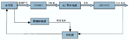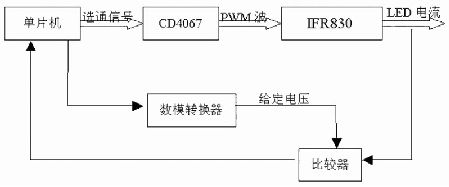 脈沖寬度調(diào)制(PWM)方式:通過人眼不易察覺的頻率快速開關(guān)LED,給人一種LED 總是亮的假象。開關(guān)時(shí)間比率決定了流過LED 的平均電流,從而決定了其亮度。脈寬調(diào)制方式和調(diào)節(jié)工作電流方式的主要區(qū)別是,沒有采用RC 積分電路,采用IFR830 代替2SK1028,通過快速控制IFR830 的通斷,使得LED 電流是一個(gè)幅值恒定, 頻率很快的脈沖電流, 這樣LED 的平均電流決定了LED 的亮度,控制流程如圖3 所示。
