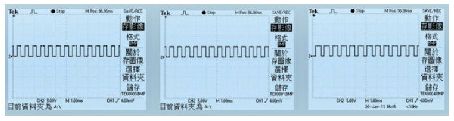 同樣,考慮到CD4067 是十六選一開關(guān),沒必要對十六路進(jìn)行控制, 擬定采用三個(gè)支路來代表整個(gè)電路的控制過程。由于控制方式的不同,那么決定LED 亮度的也不一樣,基于脈沖控制的方式是由LED 的平均電流來決定亮度的。通過編程,設(shè)定PWM 波的頻率為1KHZ,第一路的占空比為0.2, 第二路為0.4, 第三路的電流值為0.6,通過測量與LED 串聯(lián)在一起的5 歐姆電阻上的電壓,就能夠得到LED 的電流波形,從而可以看出LED的平均電流。波形分別如圖6 所示: