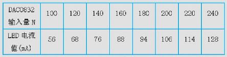 可以看出,隨著DAC0832 輸入的增大,PWM 的占空比越來越大, 對應(yīng)的LED 電流值也在不斷增大。為了得到它們之間關(guān)系, 通過不斷改變程序的方法, 來測試多個(gè)DAC0832 的輸入和關(guān)鍵點(diǎn)電壓值(考慮到0~100之間為非線性區(qū), 所以從100 開始取值) ,測得的數(shù)據(jù)如表1 所示。