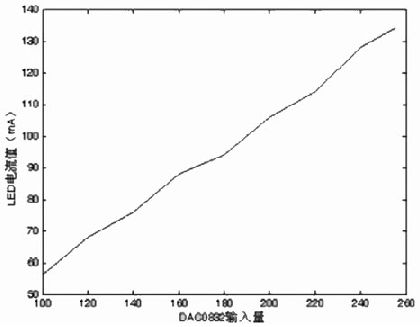 由于CD4067 芯片可以帶動(dòng)十六個(gè)支路,做實(shí)驗(yàn)的時(shí)候取代表性的三個(gè)支路進(jìn)行控制, 通過設(shè)置三個(gè)支路的電流值, 使這三個(gè)支路達(dá)到各自的亮度。但是由于不知道LED 電流值也DAC0832 輸入值之間的關(guān)系,所以進(jìn)行實(shí)驗(yàn)得到它們之間的關(guān)系, 然后就可以對通信接口進(jìn)行編程, 使得計(jì)算機(jī)界面的輸入值能夠和LED 電流對應(yīng)上。