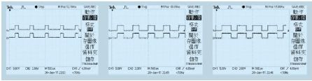 在計(jì)算機(jī)操作界面上,對第一路的DAC0832 輸入為100, 第二路為200, 第三路的電流值為255,測得對應(yīng)支路LED 的電流值為54mA、106mA、134mA,對應(yīng)2SK1058 的驅(qū)動(dòng)波形分別圖4 所示。