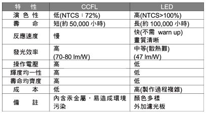 LED因耗電低、不含汞、壽命長(zhǎng)、體積小、降低二氧化碳排放量等優(yōu)勢(shì)吸引國(guó)內(nèi)、外廠(chǎng)商極力推廣取代現(xiàn)有照明。 LED主要照明可分為顯示背光、車(chē)用照明、交通號(hào)志與室內(nèi)室外照明,而背光模組于2009年被廣泛的應(yīng)用于筆記型電腦面板上,此后亦逐漸被使用到家用電視機(jī),其約占了50%之面板模組零組件制造成本與消耗約70%顯示器之電能,故背光照明為顯示面板最重要的關(guān)鍵。 然液晶顯示器無(wú)法自行發(fā)光,因此需要背光模組作為光線(xiàn)的來(lái)源,所以背光源的好壞會(huì)影響顯示的效果甚劇。 加上面板需薄型化的因素,因此多以CCFL燈管作為背光源,而LED背光源比起CCFL有演色性佳、壽命長(zhǎng)、反應(yīng)速度快等優(yōu)勢(shì)(如表1)。