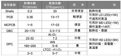 在陶瓷材料上以DPC成型之基板,具有耐高電壓、耐高溫、與LED熱膨脹系數(shù)匹配等優(yōu)勢(shì)外,還可將熱阻下降到10℃/W以下,故此為現(xiàn)今最合適用在封裝高密度排列之HB LED散熱材料。