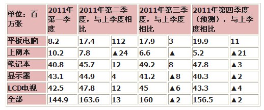 分用途以及整體的液晶面板供貨量見下表。其中不包括用于智能手機和數碼相機用小尺寸液晶面板。