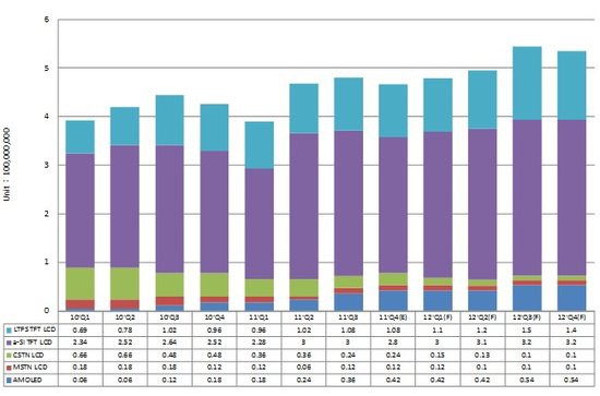 拓墣表示,目前生產像素數超過WVGA高分辨率手機面板,需要采用LTPS TFT基板生產線,2010年智能手機用TFT LCD面板的出貨量,TMD(Toshiba Mobile Display)和Sony Mobile Display兩家業者遙遙領先,分別占30.2%及21.0%,而韓國SMD占18.4%,Sharp占16.3%,臺廠僅拿下5.6%,其中日系面板廠所占的比重接近70%。因此,不論功耗與視覺極限問題,目前高分辨率顯示面板市場需求情況對日、韓系面板廠而言的確相當有利,并藉由高端規格來提倡LTPS TFT技術,遠遠拉開其它競爭對手的追趕。