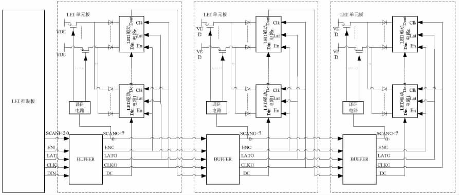 LED 控制板與LED 單元板構成的LED 顯示系統(tǒng)的主體,如圖1 所示。其中,LED 單元板包括了增強信號驅(qū)動能力的BUFFER 電路、產(chǎn)生動態(tài)顯示掃描時序的譯碼電路、若干個開關管和若干個LED 驅(qū)動電路。其通信過程為:LED 控制板發(fā)出的通信信號依次經(jīng)過各串接的LED 單元板的BUFFER 電路進行驅(qū)動增強;各LED 單元板中經(jīng)BUFFER 電路增強后的掃描信號(SCANO)提供給本LED 單元板的譯碼電路,譯碼電路譯碼產(chǎn)生動態(tài)顯示掃描時序控制開關管;各LED 單元板中經(jīng)BUFFER 電路增強后的使能信號(ENO)、鎖存信號(LATO)、時鐘信號(CLKO)分別提供給本LED 單元板中所有LED 驅(qū)動電路。