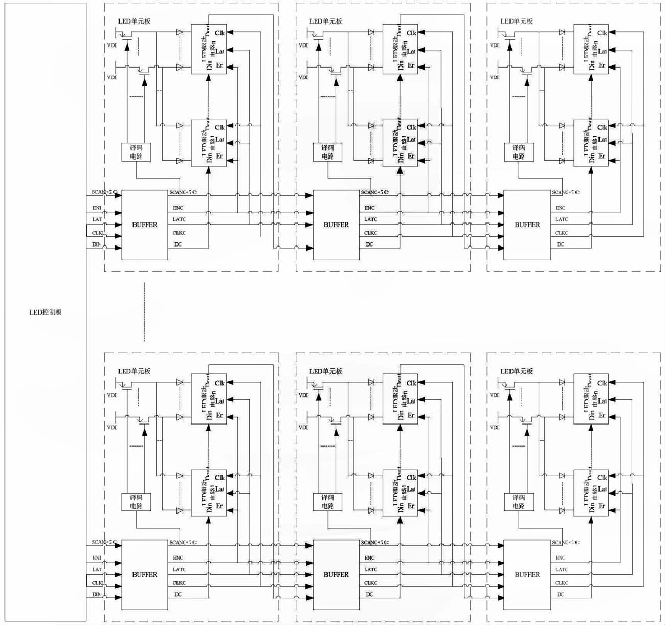 定義LED 通信電路包括通信信號輸入端、通信信號輸出端、動態(tài)顯示掃描時序輸出端(SCAN<7:0>)、控制信號輸出端(En、Lat、Clk)、數(shù)據(jù)輸出端(DATAOUT);定義通信信號包括通信信號輸出指令、動態(tài)顯示掃描時序解析指令、控制信號時序控制解析指令、數(shù)據(jù);各LED 單元板上LED 通信電路根據(jù)接收到的通信信號,解析出通信信號輸出并經(jīng)通信信號輸出端提供給下一個LED 單元板的LED 通信電路的通信信號輸入端;各LED 單元板的LED 通信電路根據(jù)接收到的通信信號,解析出動態(tài)顯示掃描時序并經(jīng)動態(tài)顯示掃描時序輸出端(SCAN<7:0>)控制本LED 單元板的開關管;各LED 單元板的LED 通信電路根據(jù)接收到的通信信號,解析出控制信號時序并經(jīng)控制信號輸出端(En、Lat、Clk)控制本LED 單元板的LED 驅(qū)動電路;各LED 單元板的LED 通信電路根據(jù)接收到的通信信號,解析出數(shù)據(jù),經(jīng)數(shù)據(jù)輸出端(DATAOUT)提供給本LED 單元板的第一驅(qū)動電路數(shù)據(jù)信號輸入,本LED 單元板的各LED 驅(qū)動電路的數(shù)據(jù)信號輸出連接下一個LED 驅(qū)動電路的數(shù)據(jù)信號輸入,最后一個LED 單元板的LED 通信電路的通信信號輸出端懸空或者返回到LED 控制板。