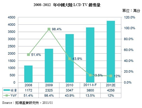 - 2011年中國大陸LCD TV年銷售量預估將成長13.5%