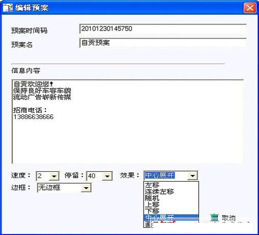 ★ 文本顯示方式有左移,下移,畫卷展開等多種效果,速度30級可調、停頓時間50級可調。