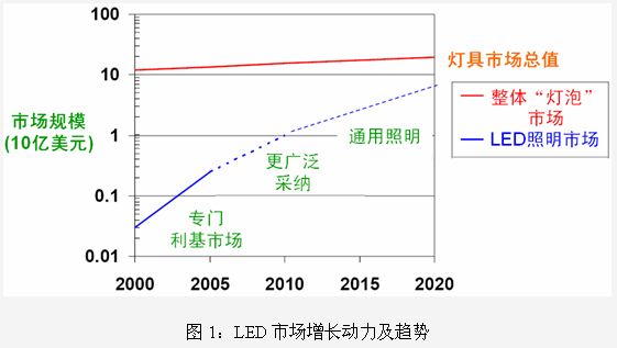 高亮度LED的光輸出、能效及成本正在迅速改善,使其應(yīng)用范圍不斷擴大。根據(jù)LED的工作電壓可以劃分為三個功率等級:0.9V至7V(手機和移動設(shè)備)、7V至60V(汽車和LCD背光)和60V至700V(通用照明)。這當中市場成長潛力最大的是汽車、LCD背光和通用照明。汽車應(yīng)用主要包括氖燈替代、應(yīng)急車輛燈、組合尾燈、儀表盤照明、信息娛樂、內(nèi)部照明、中央高位剎車燈、前照燈、停車燈等;LCD背光主要包括大屏幕液晶電視、中等屏幕的筆記本、GPS、相框、上網(wǎng)本等;通用照明主要有離線LED驅(qū)動器/鎮(zhèn)流器、街道/區(qū)域照明、替代燈泡、替代熒光燈、交通信號燈、工作照明、景觀照明、建筑物照明等。不難看出,今后LED照明將逐步進入到更多的應(yīng)用領(lǐng)域。