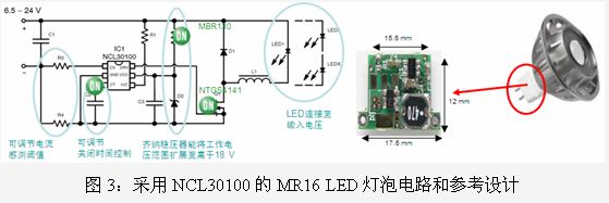 還有一款MR16 LED方案是用于降壓型應(yīng)用的NCL30100,它是能效大于95%的LED驅(qū)動器控制器,開關(guān)頻率高達700kHz,不需要輸出電容,Vcc工作范圍從6.35至18 V,可以驅(qū)動一個或多個大功率LED,主要用在MR16 LED照明、環(huán)境燈照明、太陽能LED、交通照明、室外照明和LED光條等應(yīng)用。其PCB非常小巧,可以裝入MR16燈的燈座內(nèi)。NCL30160的遲滯控制特性可在負載瞬期間提供快速的回應(yīng),無需小型信號控制環(huán)路補償元件。保護特性包括可利用電阻設(shè)定LED電流、LED短路保護、欠壓鎖定及熱關(guān)閉。