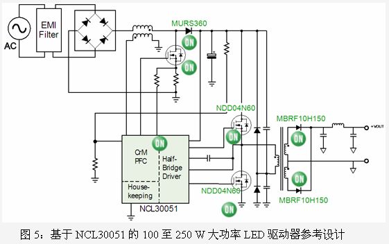 另一款專用LED電源集成電路是NCL30051,能夠為降壓直流-直流(DC-DC)轉(zhuǎn)換器/LED驅(qū)動器提供恒定電壓。該器件集成了一個臨界導電模式(CrM) PFC控制器及一個半橋諧振控制器,并內(nèi)置600V驅(qū)動器,針對離線電源應(yīng)用進行了優(yōu)化,具備了所有實現(xiàn)高能效、小外形因數(shù)設(shè)計所需的特性。