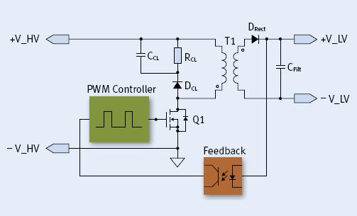 對于最高約100W的隔離電源,反激式拓撲已被廣為接受,因為它相對簡單,構成元件少,具有成本效益優勢且性能合理。借助飛兆半導體應用手冊AN-4137,其基本工作原理簡單并易于解釋。當MOSFET Q1導通時,變壓器T1初級端中的電流線性斜升,建立了一個儲存能量的磁場,變壓器繞組的極性點顯示極性滿足條件以致次級端整流器DRect在此期間關斷。一旦MOSFET斷開,根據楞次定律(Lenz''s law),跨越變壓器的所有電壓的極性反轉。DRect現在開始導通且儲存在T1中的能量傳送到電容器CFilt中。PWM控制器的占空比(Duty cycle)和變壓器圈比一起決定輸出電壓,其在隔離反饋網絡的幫助下是穩定的。因為初級和次級之間的不完全耦合,即漏電感的存在,網絡DCL、CCL 和RCL鉗位電壓突升。這對于減少Q1的電壓應力是重要的,但同時也是功率損耗的一個來源,因為RCL中的能量被消耗了。
