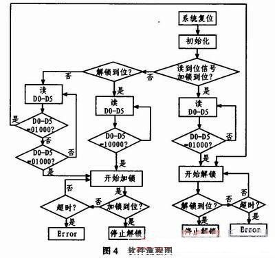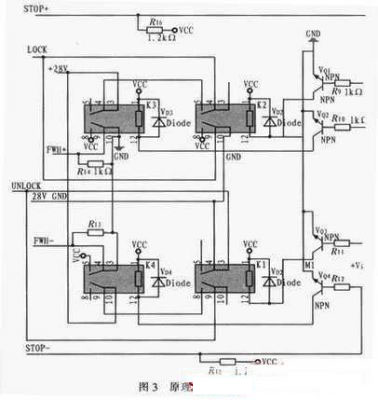 當(dāng)信號D0-D5為10000時,單片機通過P10口對方位鎖定機構(gòu)發(fā)出加鎖命令,控制命令經(jīng)SN54LS245驅(qū)動后作用于R9和VQ1,VQ1導(dǎo)通后,繼電器K2的4、5導(dǎo)通,輸出+28 VLOCK信號控制電機進(jìn)行加鎖。完全鎖定后,光電開關(guān)輸出(上)信號輸出高電平即圖3中STOP+,STOP+通過上拉電阻R16作用于R10和VQ2,VQ2導(dǎo)通后,繼電器K3的4、5和8、9導(dǎo)通,+28 V LOCK信號切斷,硬件上先停止加鎖控制,防止造成機構(gòu)硬件損傷。而K3的8、9導(dǎo)通后,F(xiàn)WH+輸出+5 V電平給單片機,單片機接收信號后,終止加鎖命令,VQ1截止,K3恢復(fù)常態(tài)。解鎖過程和加鎖過程類似,在此不作贅述。