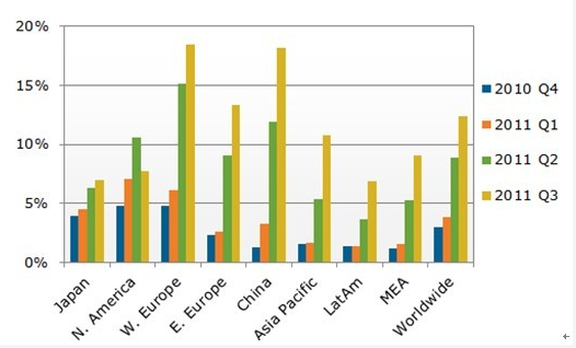 圖一、Q4’10-Q3’11全球分區域3D電視滲透率