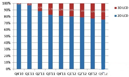 根據NPD DisplaySearch的調查,在元旦期間的主要城市賣場,3D液晶電視在零售終端滲透率甚至高達40%;而整體3D液晶電視出貨滲透率可望在2012年第一季超過20%;該機構在全球電視出貨與預測季報(Quarterly Advanced Global TV Shipment and Forecast Report)中預測,到2012年第四季,中國大陸 3D液晶電視滲透率可達25%。