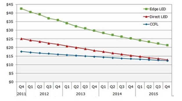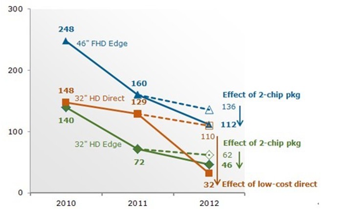 直下式LED背光源電視的材料成本與CCFL背光源的材料成本接近。NPD DisplaySearch預(yù)估以32寸液晶電視來(lái)說(shuō),直下式LED背光源的成本為CCFL背光源的1.3-1.4倍,而側(cè)光式LED背光源估計(jì)成本則超過(guò)CCFL背光源的兩倍。以40寸液晶電視來(lái)說(shuō),成本節(jié)省更顯著,低價(jià)直下式背光源材料成本減少近40元美金,而終端產(chǎn)品成本節(jié)省更可以達(dá)100美金。