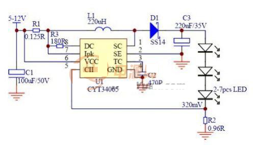 CYT34065特別適合設計3-12V升壓設計,輸出12-24V以上。也可以設計36V-24V甚至低于12V降壓驅(qū)動線路,CV或CC模式,降壓低至1.25V以上的輸出電壓。CYT34065仍然滿足輸出DC恒壓模式設計,完全兼容CYT34063應用。輸出采樣基準需要重新計算外,不需要修改原設計PCB線路。并且還能設計低于1.25V或更低的電壓范圍。