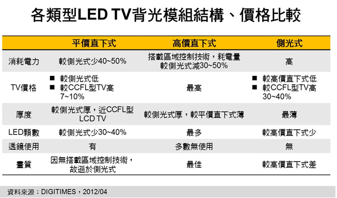 近期南韓TV業(yè)者如三星電子(Samsung Electronics)及樂金電子(LG Electronics)為吸引消費者需求,開發(fā)出消耗電力較低、價格亦較低的直下式LED TV機種,價差與CCFL 型LCD TV拉近至10%以內(nèi)。