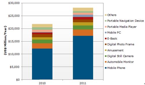 - 應(yīng)用于手機(jī)的主動(dòng)矩陣式顯示器的出貨量增加到2011年的15億臺(tái)