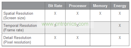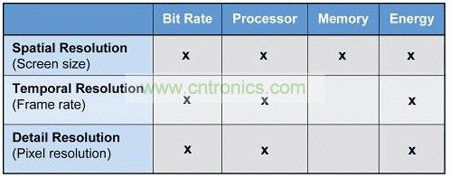 表 1 給出了不同視頻編碼參數(shù)對(duì)解碼設(shè)備所需資源選擇的大致影響。該表專門對(duì)采用運(yùn)動(dòng)補(bǔ)償與離散余弦變換 (DCT) 技術(shù)實(shí)現(xiàn)視頻壓縮的基于塊的視頻編解碼器進(jìn)行了分析。