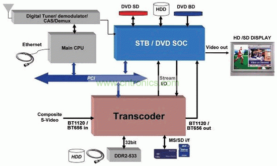 轉(zhuǎn)碼硬件必須與整個(gè) STB 系統(tǒng)中的其他系統(tǒng)進(jìn)行良好交互,其中包括數(shù)字調(diào)諧器、解多路復(fù)用器 (Demuxer) 和解調(diào)器、DDR2 存儲(chǔ)器、PCI 總線,以及向 STB SoC 傳輸音/視頻的高帶寬接口。圖 2 給出了常見的架構(gòu)示意圖,但這不一定是一般性架構(gòu)。