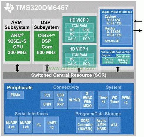 圖 3. 基于達(dá)芬奇技術(shù)的 TMS320DM6467 數(shù)字媒體處理器方框圖