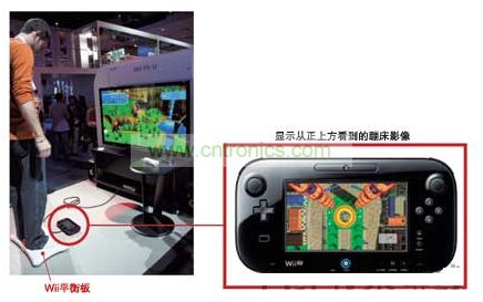 在Wii U游戲“Wii Fit U”內的迷你游戲“Trampoli neTarget”中,在蹦床上彈跳時,周圍的景象會映在電視屏幕上,而GamePad屏幕上則顯示從正上方俯視蹦床的影像。蹦得越高屏幕上顯示的蹦床就會變得越小。