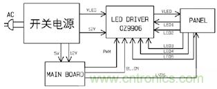 電視顯示系統包括電源板、主板、背光驅動板等, 電源板提供VLED、12V給背光板,主板提供背光控制信號BL_ON和調光PWM信號給背光板。背光驅動ICOZ9906 檢測PANEL內部五條燈條的流過的電流,進行定電流和電流平衡控制,點亮背光系統。