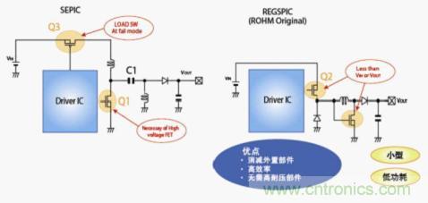 面對車載特有的電池電壓波動和多樣化的LED燈數,以升壓方式和降壓方式很難進行LED的閃爍控制與平臺設計,要滿足市場所要求的高可靠性與縮短開發周期之間的平衡實屬不易。因此,為了不依賴電池電壓、可以始終穩定供給DC/DC轉換器輸出電壓,ROHM采用了一種稱為“REGSPIC結構”的獨有升降壓方式。下面介紹REGSPIC結構與一般的升降壓方式所用的SEPIC結構相比所具有兩個優點。