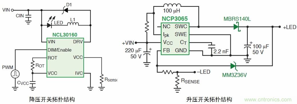 用于中等電壓通用照明的開關(guān)驅(qū)動器有多種拓?fù)洌缃祲骸⑸龎海唤祲?升壓的NCP3065和NCP3066(可以配置為控制器)、NCP3163、MC33163、NCP1294;降壓的CAT4201、NCP1034、NCL30100、NCL30105、NCL30160、NCL30161;此外還有升壓或SEPIC的CS5171/3。