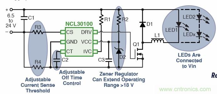 針對空間及高能效要求的低功率應(yīng)用,安森美半導(dǎo)體提供一款能效高達95%,又具有自然LED開路保護的固定關(guān)閉時間降壓LED驅(qū)動器控制器NCL30100。該器件采用準(zhǔn)固定關(guān)閉時間、峰值電流遲滯控制方法,不要求補償元件;其低邊N-FET開關(guān)拓?fù)溥m合連續(xù)導(dǎo)電模式工作,無須輸出電容;其工作頻率小于500 kHz,±5%典型穩(wěn)流容限,VCC工作電壓范圍為6.35至18 V。