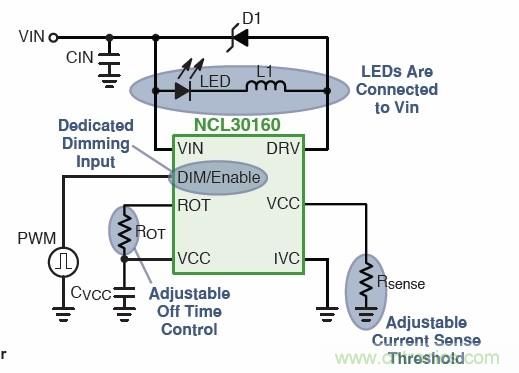 大功率LED可采用安森美半導(dǎo)體的恒流降壓LED驅(qū)動器NCL30160,實現(xiàn)高達98%的能效。它采用30 mΩ集成MOSFET,100%占空比可提供高能效;輸入電壓范圍為6.3 V至40 V,開關(guān)頻率可達1.4 MHz;還具有專用PWM調(diào)光引腳/低功率關(guān)閉、無須控制環(huán)路補償和1.5 A平均電流能力。
