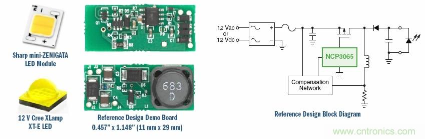對于3至4個LED模塊的12 V AC-DC設(shè)計,可以使用安森美半導(dǎo)體針對NCP3065的評估板NCP3065BBGEVB,用來驅(qū)動12 Vac/Vdc應(yīng)用中的夏普ZENIGATA™、Cree XLamp™MC-E及其他LED模塊。其特點是小尺寸、寬輸入和輸出工作電壓,輸出電流經(jīng)過穩(wěn)流,還具有LED開路保護、輸出短路保護能力。該解決方案適用于MR16燈泡、景觀照明、交通照明。