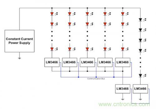 在本應用中,LM3466 集成電路可互相通信,確保恒定電流電源所強加的輸入電流能夠在各串之間進行平均分配。線性穩壓器會吸收 LED 堆棧正向電壓的任何差異。