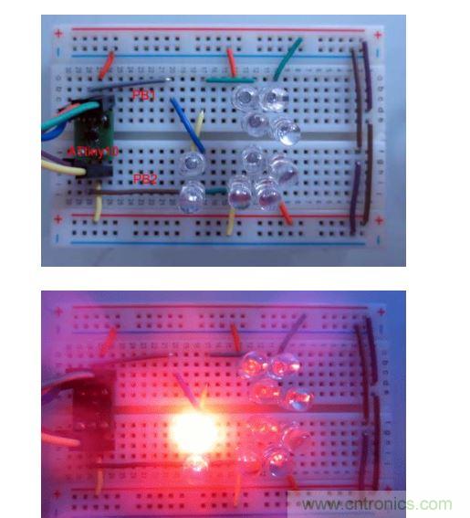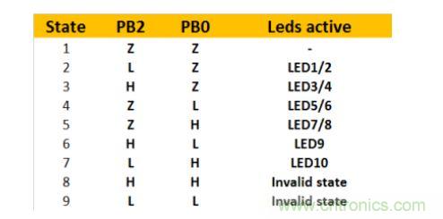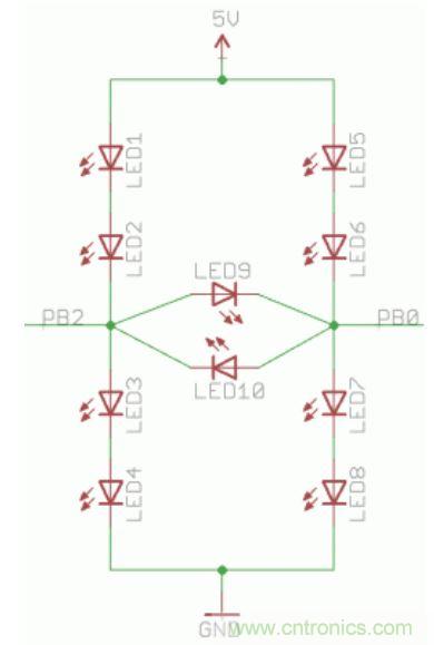 當(dāng)PB0和PB2中有一個(gè)引腳處于高電平或低電平狀態(tài),而另一個(gè)引腳為高阻抗?fàn)顟B(tài)時(shí),那就會(huì)有一對(duì)LED會(huì)發(fā)光。而當(dāng)PB0為高電平而PB2為低電平或恰好相反時(shí),LED9或LED10就將和一對(duì)LED并聯(lián)。這時(shí)大部分的電流會(huì)流過單個(gè)LED,所以這時(shí)只有LED9或LED10會(huì)發(fā)光。