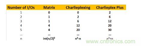 我們可以講這種新的方案成為“查理復(fù)用+(Charlieplex Plus)”。分析表明,依靠這樣的技術(shù),一個(gè)I/O口可以比普通的查理復(fù)用技術(shù)多控制兩個(gè)LED。也就是說n個(gè)I/O口所能控制的LED數(shù)量就為2n+n²-n = n²+n。具體情況如上表所示。